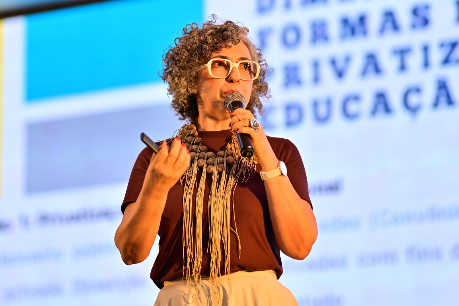 Conforme a expositora, o processo de privatização da educação pública é complexo e impulsionado por uma transformação ideológica e por uma disputa de concepção de sociedade. “Muitas vezes, sem perceber, acabamos endossando esse modelo educacional, que vai além da simples transferência de recursos públicos.”